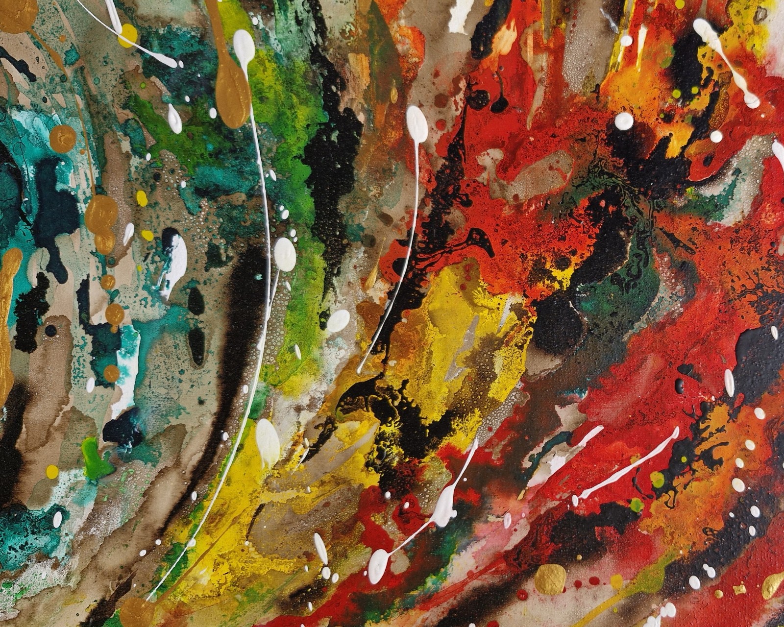 No hay pinceles en esta obra. Solo herramientas rígidas y elementos de goteo que permiten que la materia se desplace, se expanda y se encuentre con el azar. La pintura se mueve, respira, se manifiesta sin restricciones.