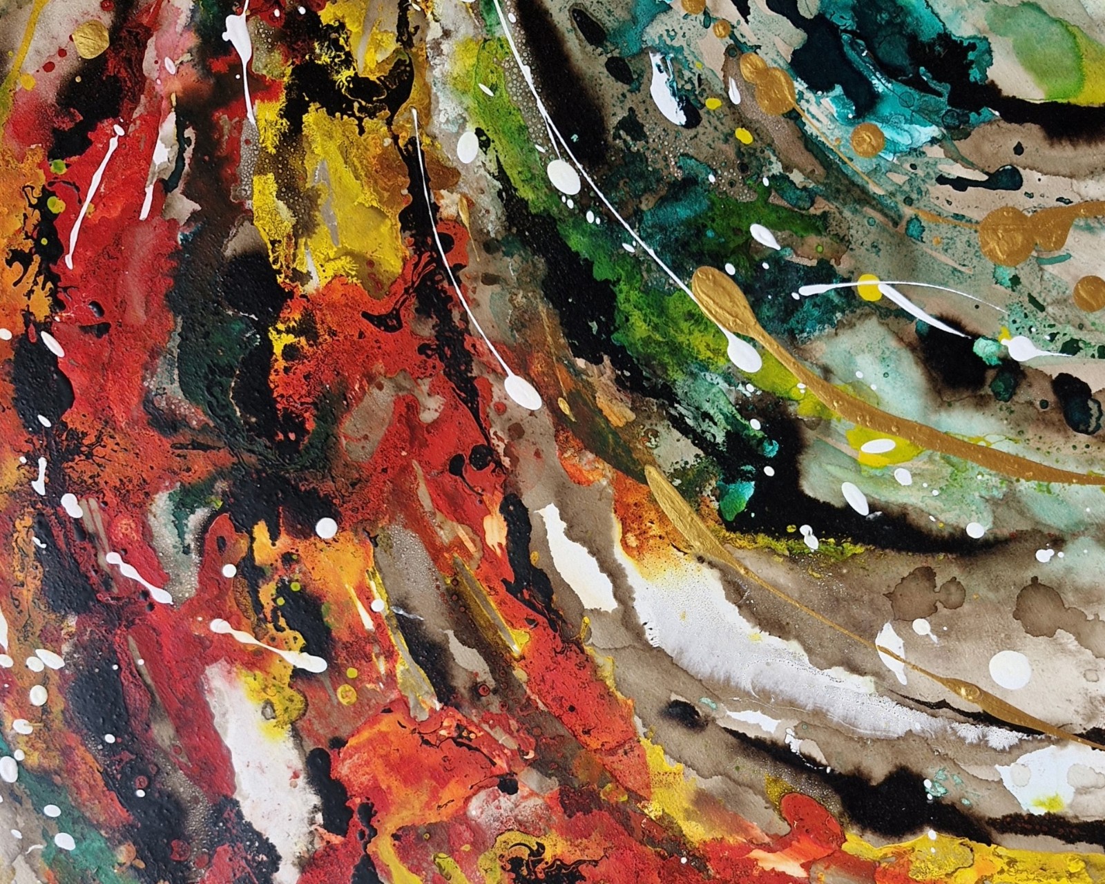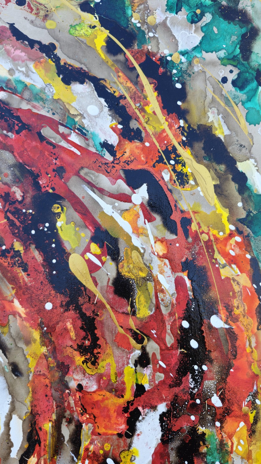 El proceso fue guiado por la experimentación: tintas chinas de colores intensos que fluyen sin control, pintura asfáltica densa que se transforma al contacto con solventes, y una combinación de líquidos que reaccionan entre sí generando efectos imprevisibles. Cada capa es el resultado de un diálogo vivo entre los materiales.