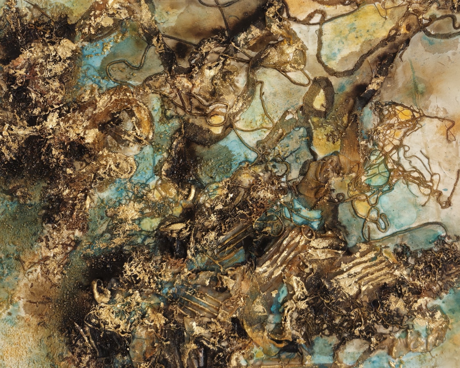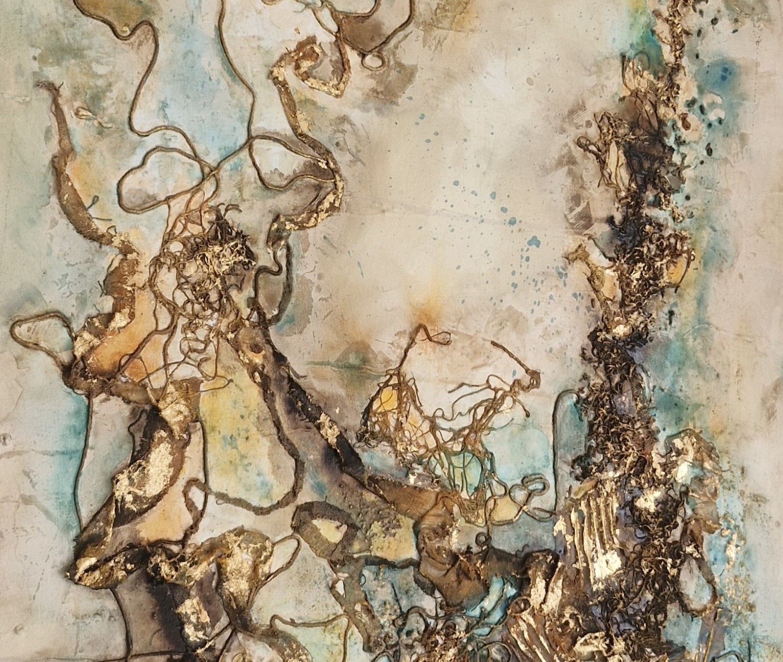 Entre texturas orgánicas y destellos dorados, se esconde la búsqueda por entender quiénes somos y de dónde venimos.