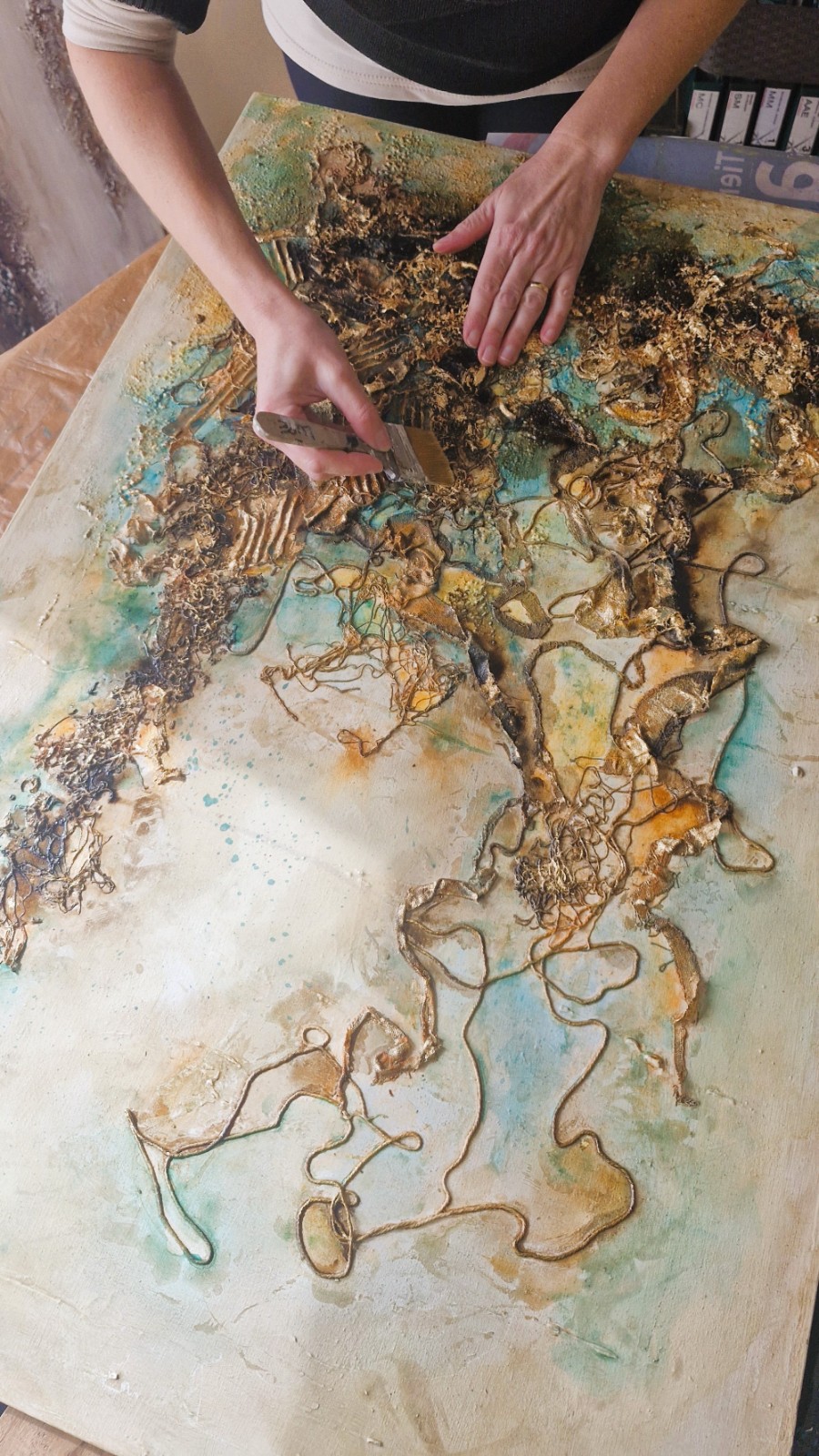 Técnica: mixta (Texturas, café, acrílico, pintura asfáltica y dorado a la hoja)