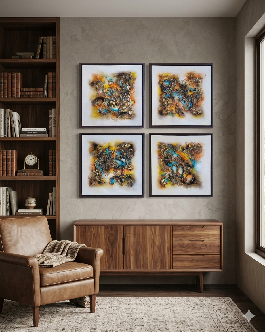 Medidas: Poliptico formado por 4 obras de 52 x 52 x 3 cm cada una.