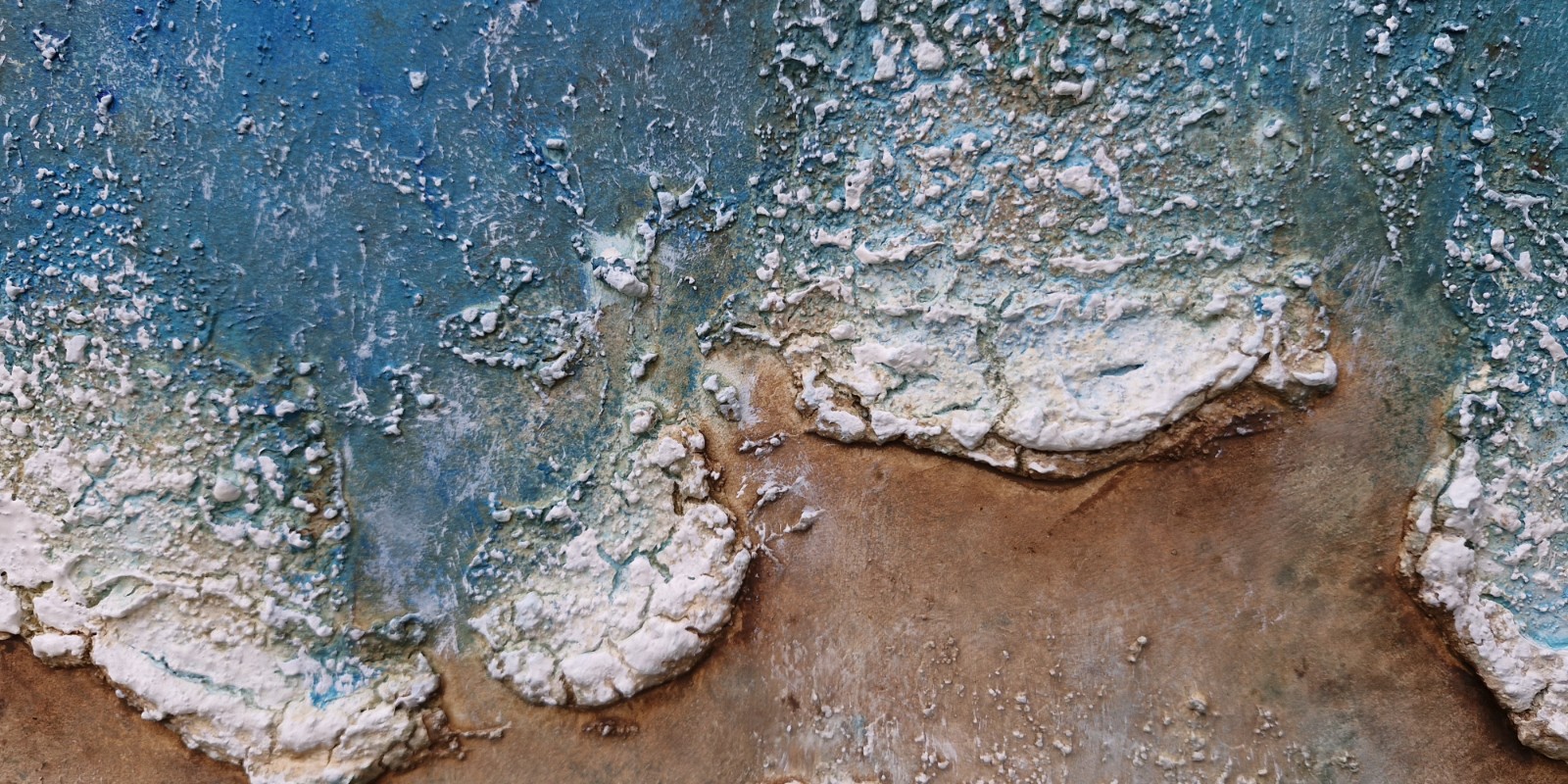 Capas, raspados, veladuras y reacciones entre medios crean superficies que recuerdan formaciones minerales, costas erosionadas o paisajes vistos desde la distancia.