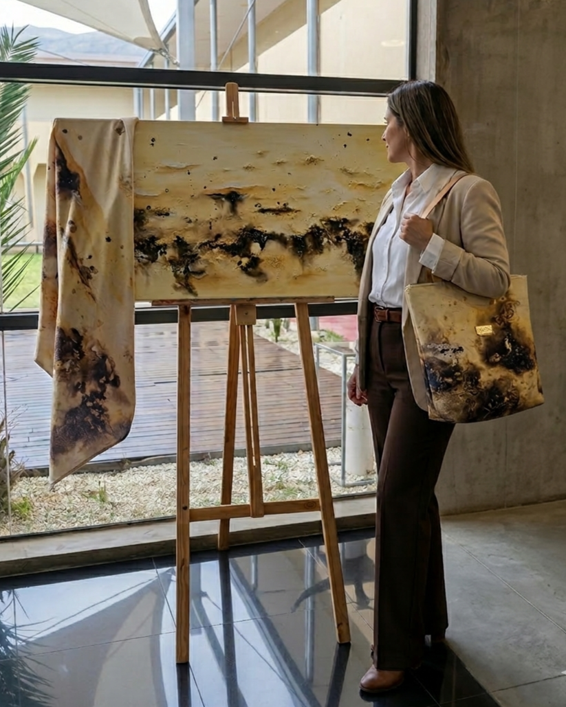 A partir de estas pinturas, el lenguaje se expande: fragmentos de obra se transforman en piezas que habitan lo cotidiano.